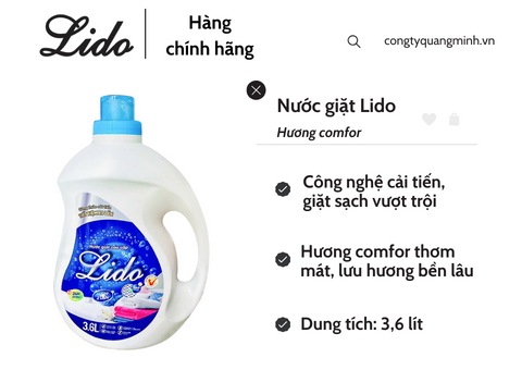 Nước giặt Lido hương comfor: Với công thức cải tiến mới, nước giặt LIDO giúp giặt sạch nhanh, tiết kiệm nước và tiết kiệm thời gian. Nước giặt Lido hương comfor thơm mát, lưu hương bền lâu